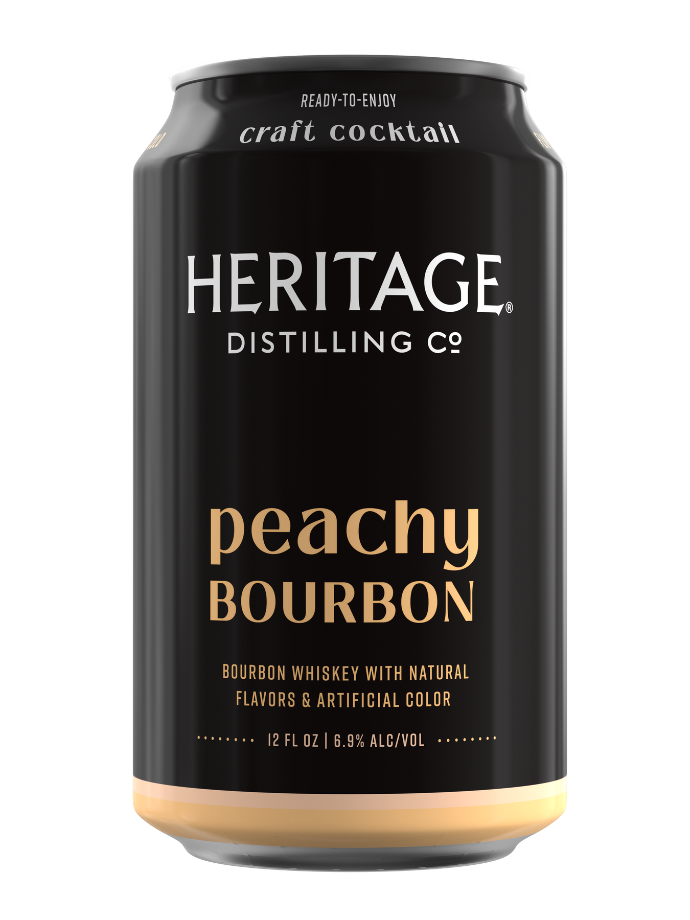 Taking a sip of Peachy Bourbon is a little surprising with sweetness up front but a signature whiskey kick in the back. It is classic Heritage Bourbon mixed with peachy bourbon syrup, lemon flavorings & a little fizz.