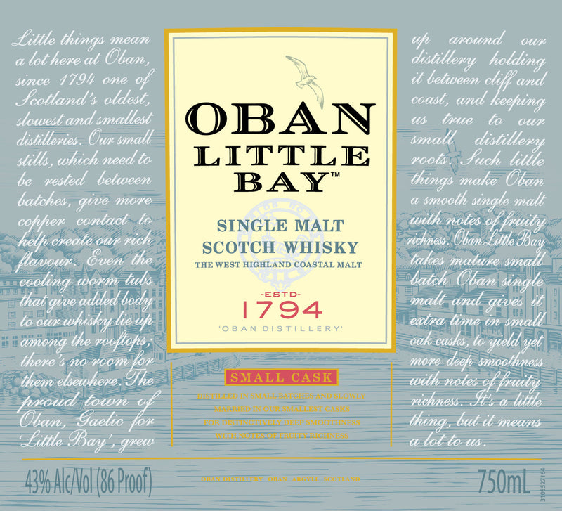 Oban Little Bay is a refined single malt Scotch whisky crafted on the rugged west coast of Scotland in one of the country’s oldest and smallest distilleries, established in 1794. This West Highland coastal malt undergoes an extra maturation in Oban’s smallest oak casks, intensifying its flavor and enriching its signature smoothness.