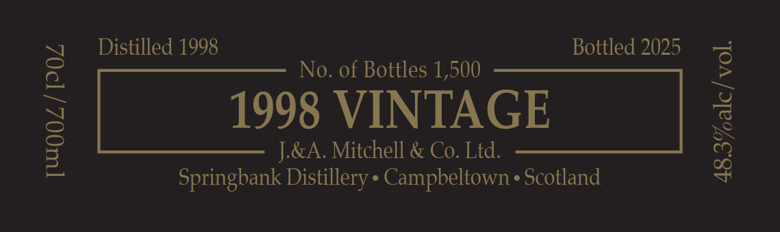 Distilled in 1998 and bottled in 2025, this Single Malt Scotch Whisky was crafted to highlight the profound influence of time and high-quality cask maturation. With only 1,500 bottles available worldwide, this limited edition whisky captures the signature depth and complexity of older Springbank expressions, matured in a range of exceptional oak casks.