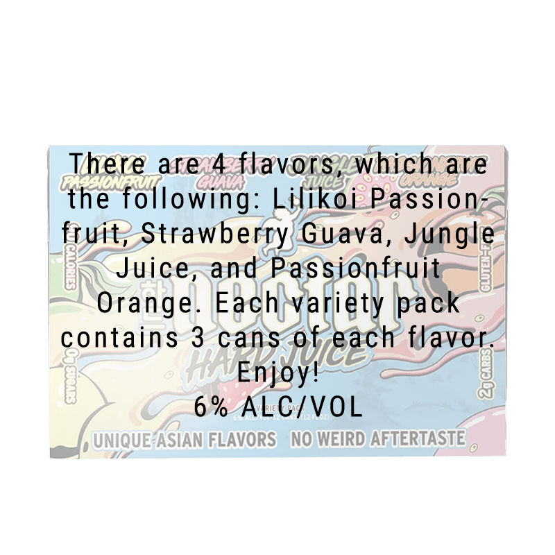 There are 4 flavors, which are the following: Lilikoi Passionfruit, Strawberry Guava, Jungle Juice, and Passionfruit Orange. Each variety pack contains 3 cans of each flavor. Enjoy!