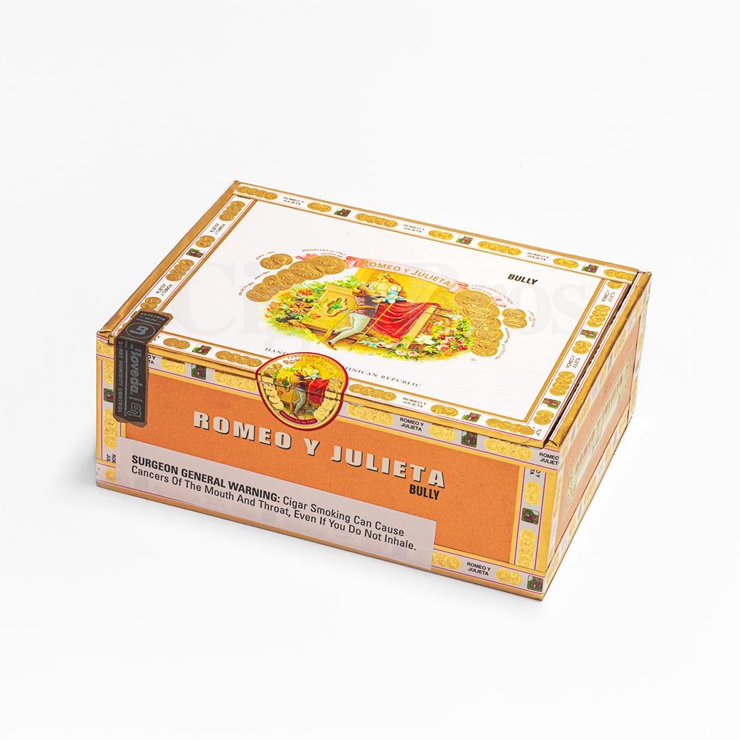 A romantic illustration of Romeo and Juliet on a balcony with gold medals and bold "ROMEO Y JULIETA" honors CigarBros’ Romeo Y Julieta 1875 Bully Dominican cigars, available in a box of 25.
